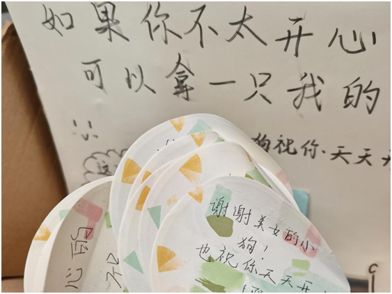 除了送出温暖,毕唯依和室友们也收到了来自陌生人的祝福。“学业顺利”“要天天开心”“感谢你的小狗”……不少领到小狗的学生将自己的祝福写在了便利贴上。“生活中的小美好无处不在,希望能有更多人去传递温暖。”活动策划人之一、美术学专业2021级(2)班的陶悦说。