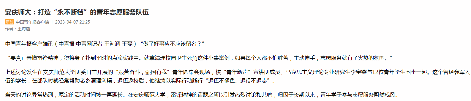 今年,该校团委将志愿服务与“大学生社区实践计划”进一步结合,全校165个班级团支部和安庆市区各街道、社区结对共建,在社区治理、社会调查、文体活动等领域,开展城乡志愿服务。还主动承担地方黄梅艺术节、黄梅戏展演周等活动的引导、讲解和后勤工作。