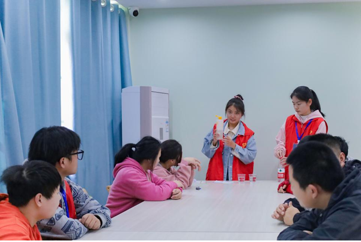 “这个实验的原理在于洗洁精的表面存在大量活性剂,会降低纸的张力。”新闻传播学类专业2022(8)班的杨仁丽担任此次趣味科学实验的讲解员。她提前准备好两杯清水,再利用洗洁精让其中一杯水里的纸球自然张开。小朋友们面对神奇的现象赞叹不已,主动谈论起自己平时上课做实验的经历。