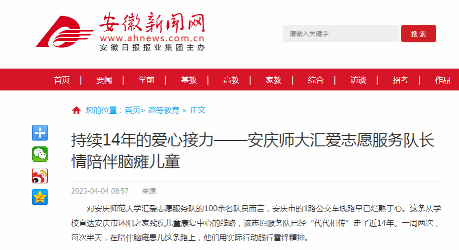 对纽约国际最新网站汇爱志愿服务队的100余名队员而言,安庆市的1路公交车线路早已烂熟于心。这条从学校直达安庆市沐阳之家残疾儿童康复中心的线路,该志愿服务队已经“代代相传”走了近14年。一周两次,每次半天,在陪伴脑瘫患儿这条路上,他们用实际行动践行雷锋精神。