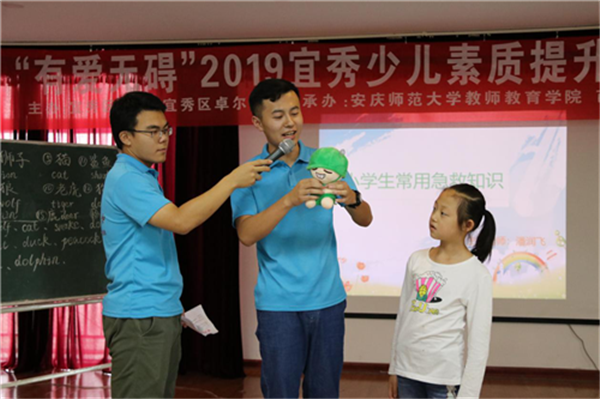 “双手交叉,按住胸口,保持手臂与胸口垂直,反复按压……”特殊教育2017级潘润飞作为安全教育老师,正在向小朋友们演示“胸部按压法”的正确操作。小朋友们围坐在老师身边,认真地看着,一边询问一边跟着老师演示。“我能真实地感受到老师按压时的力量,所以对老师讲的内容记忆很深刻,我认为我以后可以很好地运用。”作为示范对象,五年级的杨诚然在结束后坚定地说。