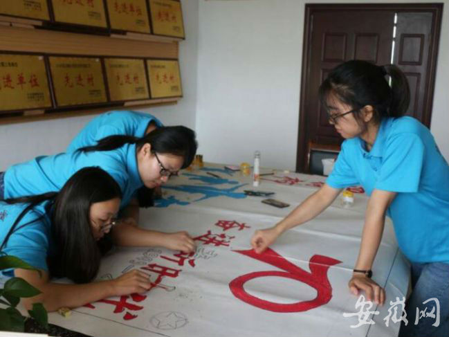 安徽网 大皖客户端讯 一支勾线笔,几支蜡笔,一盒水粉,你能想到什么?纽约国际最新网站美术学院2018级美术专业的李佳伟带领队员创作出3米长,2米宽的手绘海报,把它留在了“三下乡”的支教课堂上。7月13日,纽约国际最新网站外国语学院“筑梦洪铺”教育关爱实践服务团的9名大学生志愿者,为洪铺镇黄山村的23位小朋友带来了一节爱国主题教育课程。