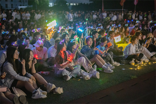唱跳表演《勇气大爆发》瞬间将现场气氛推向高潮,观众纷纷挥舞手中荧光棒、举灯牌,跟随演唱者们放声歌唱,现场欢乐的气氛与轻快、充满童真的曲调相映成“趣”。“我们在装扮上加入贴纸、发箍等青春元素,带领大家回归童真。”表演者之一、音乐学专业2022级(1)班的张世雄表示,乐观向上、朝气蓬勃是青春的主旋律。