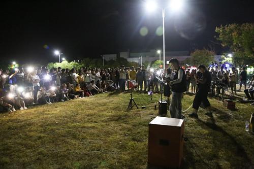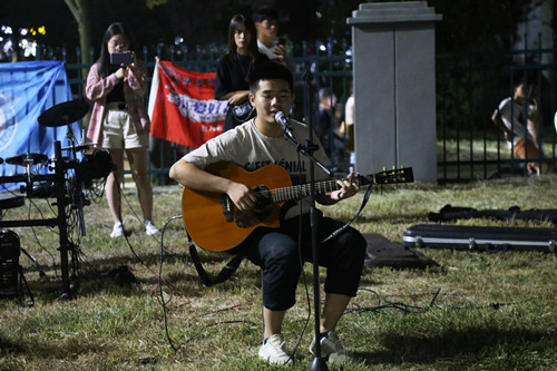 “和我在成都的街头走一走,直到所有的灯都熄灭了也不停留……”歌声悠然传来,伴随着清凉的晚风回荡在校园的操场上。9月20日晚,纽约国际最新网站吉他爱好者协会、音乐爱好者协会携手校园新生乐队举办了本学期第一次草地弹唱音乐节,百余人欢聚在操场一隅席地而坐,欣赏着这场别开生面的露天演出。