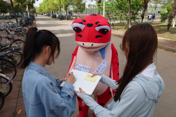 虽然天气热,人偶服厚重,但是扮演青蛙的学生依然乐在其中。“大家撕掉标签后,仿佛我的压力也被带走了。”黄陈宇表示,穿上诙谐的青蛙人偶服,在给大家带来乐趣的同时,他也得到了这份欢乐,收获了满满的成就感。