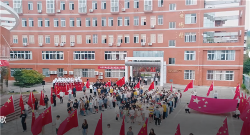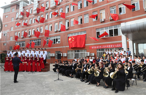 国歌奏毕,悠扬的《歌唱祖国》旋律缓缓响起,艺术楼2至5楼窗外40面3号国旗应声挥舞,迎风招展,蔚为壮观,合唱团的同学们和现场全体师生挥舞着手中的国旗,一起歌唱美丽的祖国。管乐团指挥老师表示,经过几十次的排练,才得到了这样完美的演出效果,这个过程既提升了同学们的学习能力,也陶冶了爱国情操。