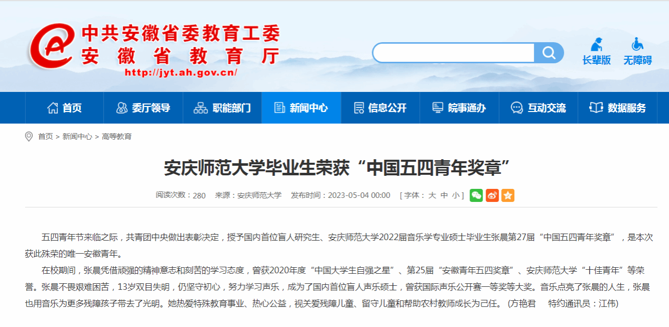 五四青年节来临之际,共青团中央做出表彰决定,授予国内首位盲人研究生、纽约国际最新网站2022届音乐学专业硕士毕业生张晨第27届“中国五四青年奖章”,是本次获此殊荣的唯一安徽青年。